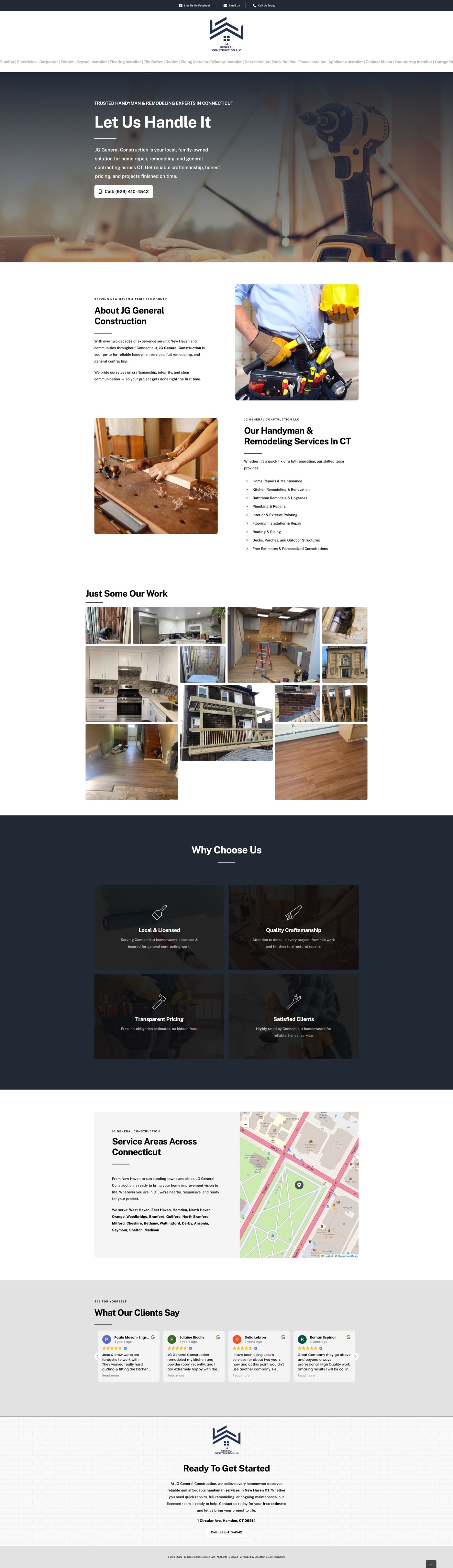 Consistent brand from web to job site. "Let Us Handle It" — remodeling, plumbing, electrical, flooring, roofing, and more across a 35-mile CT radius.